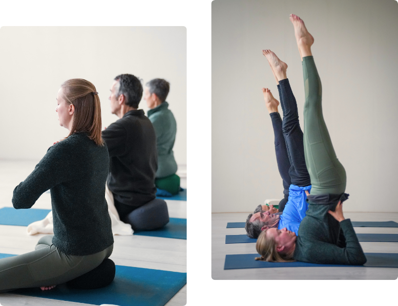 Meditatie ís yoga. Met verschillende houdingen (asana’s) bereiden we ons lijf voor op het zitten in meditatie. In de les komt spanning los en stroomt de energie weer goed in je lijf. Mediteren helpt om alles wat loskomt een plek te geven. Daarmee verklein je de kans dat spanning terugkeert en tegelijkertijd train je je bewustzijn.